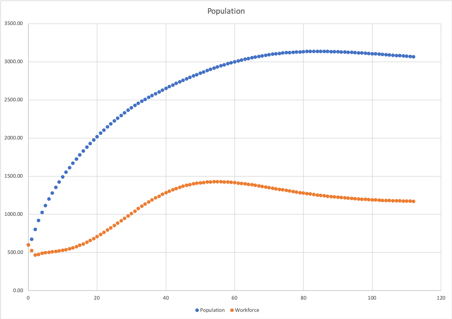 The workforce peaks at year 54, at ~1427. By this point the ship and the local economy have been focused on developing the 18 Scorpii system for 10 years. They are most likely mining that system for resources, and building new ships and settlements. The overall population is 2917. There are 1079 children under the age of 21, and 671 retirees.